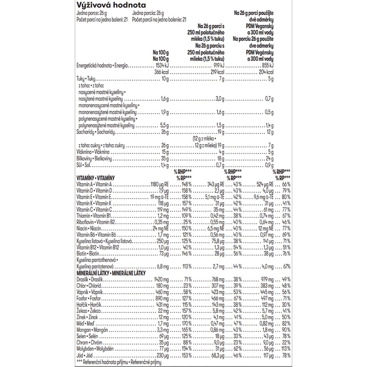 Při přípravě se 2 odměrkami PDM Vegan a 300 ml vody jedna porce obsahuje: