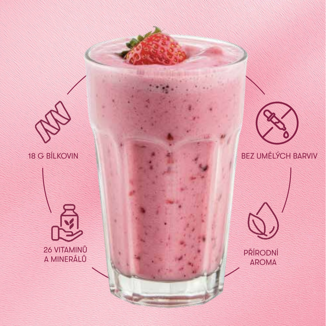 Izolát sójové bílkoviny, fruktóza, inulin, bezlepková ovesná vláknina, sójovýolej, směs minerálů (citronan vápenatý, oxid hořečnatý, fumarát železnatý, seleničitan sodný, oxid zinečnatý, uhličitan manganatý, chlorid chromitý, jodid draselný, citrát měďnatý), fosforečnan draselný, emulgátor (sójový lecitin), zahušťovadla (xanthan, guma guar), přírodní aromata, barvivo (betalainová červeň), směs vitamínů (vitamín C (L-askorbová kyselina), vitamín E (DL-α-tokoferyl-acetát), niacin (nikotinamid), vitamín A (retinyl-acetát), biotin (D-biotin), kyselina pantothenová (D-pantothenát vápenatý), vitamín D (cholekalciferol), kyselina listová (kyselina pteroylmonoglutamová), vitamín K (fyllochinon), thiamin (thiamin-hydrochlorid), vitamín B6 (pyridoxin-hydrochlorid), vitamín B12 (kyanokobalamin), riboflavin), sladidlo (steviol-glykosidy ze stévie), chlorid sodný, plod papáji v prášku, petrželová nať v prášku, bobule borůvek v prášku, semena granátového jablka v prášku, protispékavá látka (oxid křemičitý). Sladidlo z přírodního zdroje.